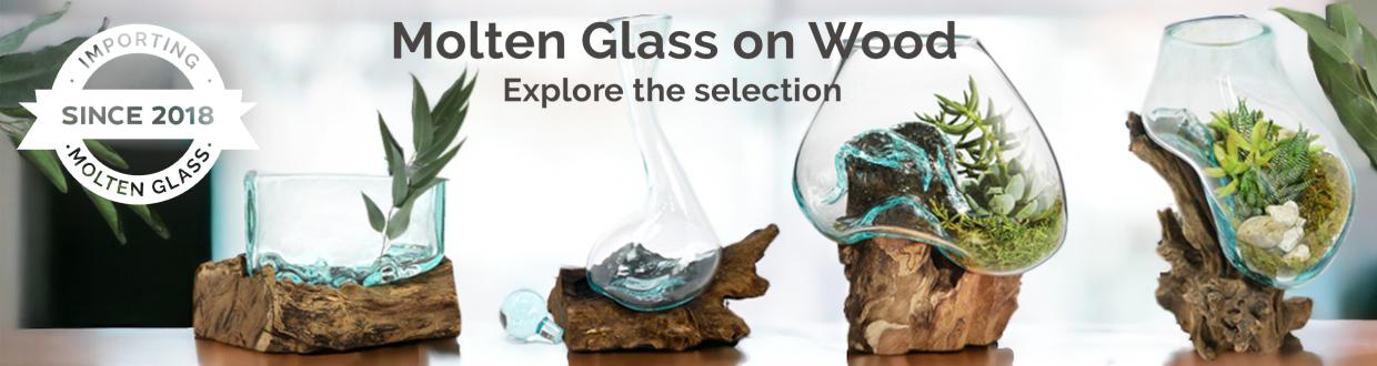 Each piece is handmade in Bali, Indonesia, where skilled artisans hand-blow molten glass and carefully place it onto natural gamal wood. As the glass cools and hardens, it naturally moulds to the contours of the wood, resulting in unique, organic shapes. No two pieces are ever the same.