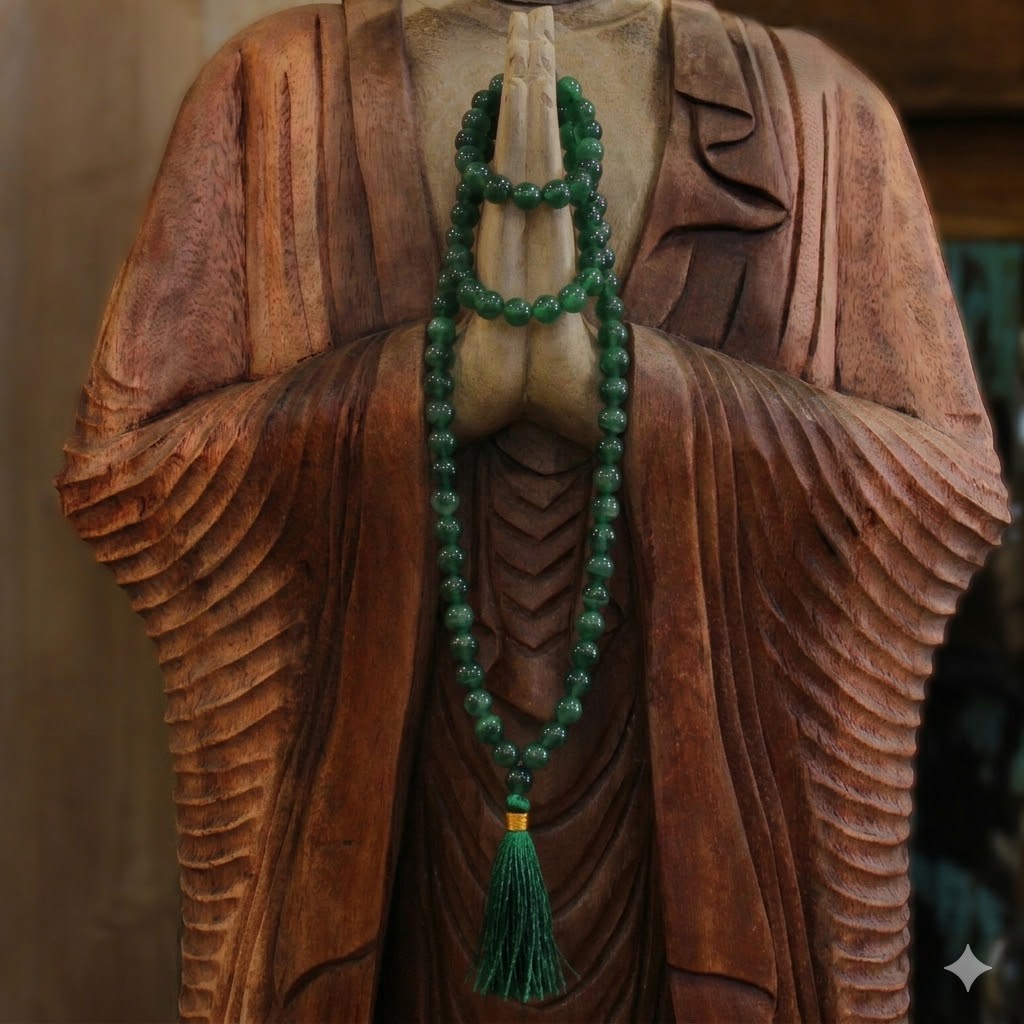 With its soft green tones and natural elegance, this mala adds a touch of tranquillity and timeless style to any outfit.