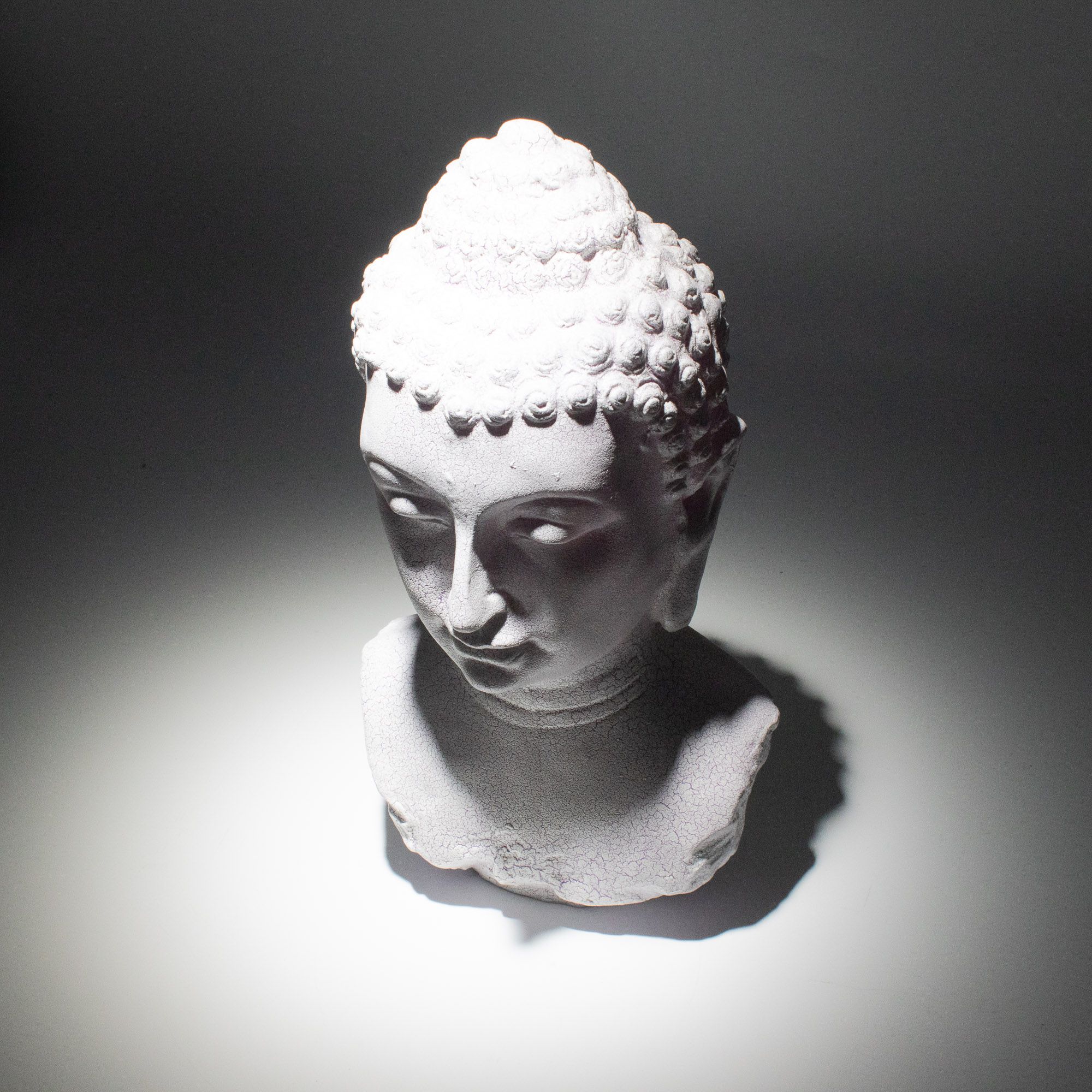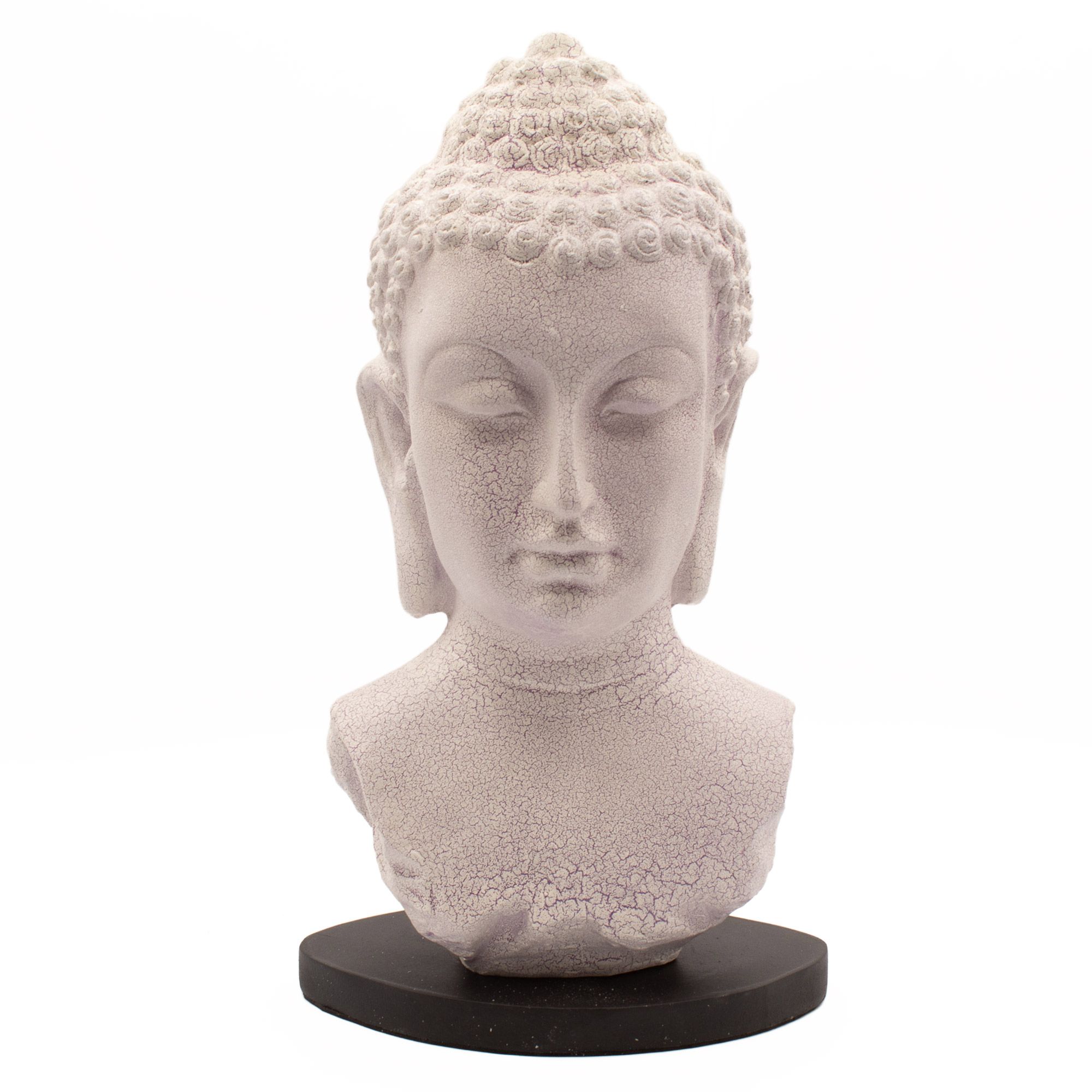 The Lavender Crackle Buddha Bust Lamp features a soft, ethereal finish. This fiberglass shade is designed with a delicate “crackle” texture that, when unlit, has a clean, stone-like appearance. When switched on, it emits a gentle lavender-purple glow, creating a calm atmosphere for bedrooms or wellness spaces.