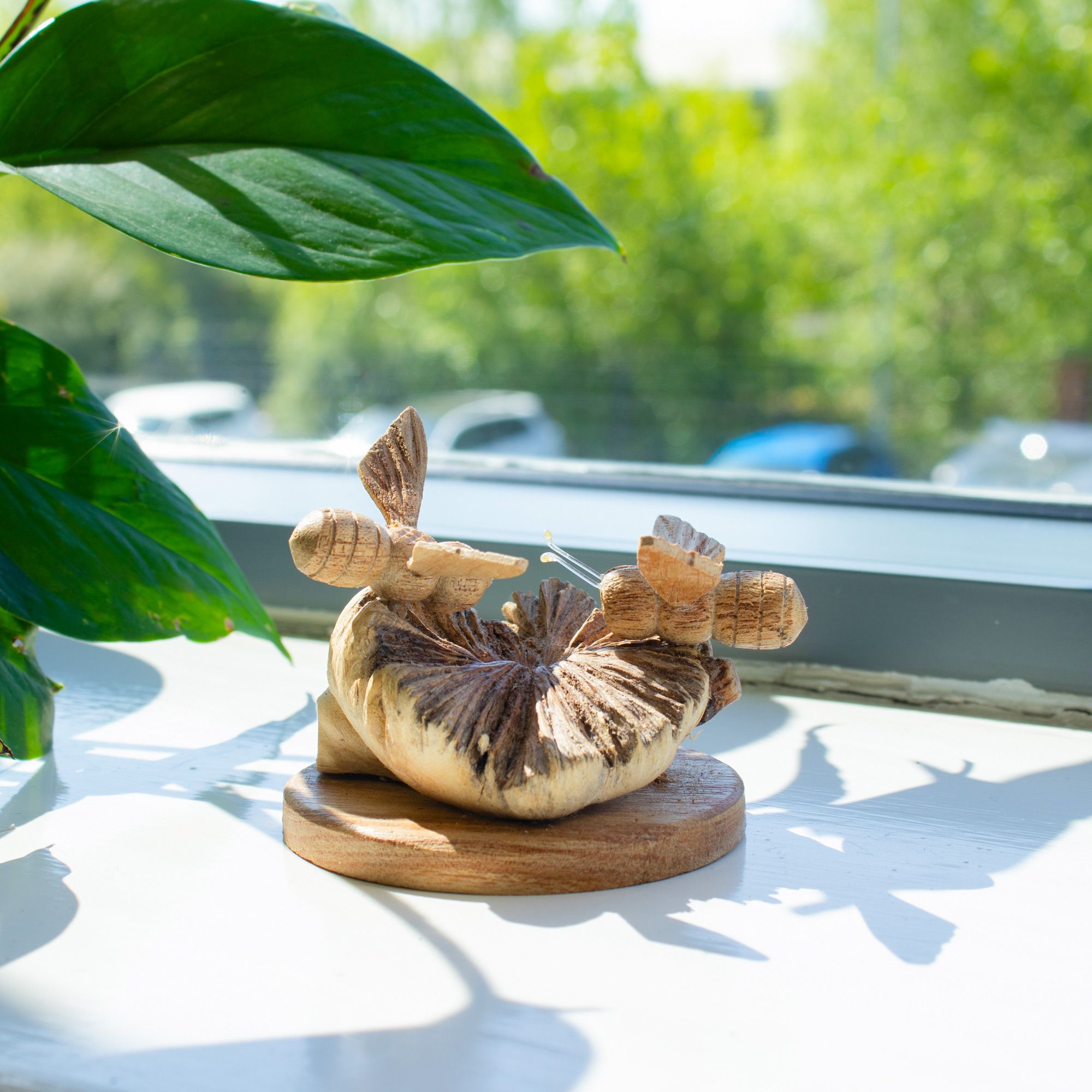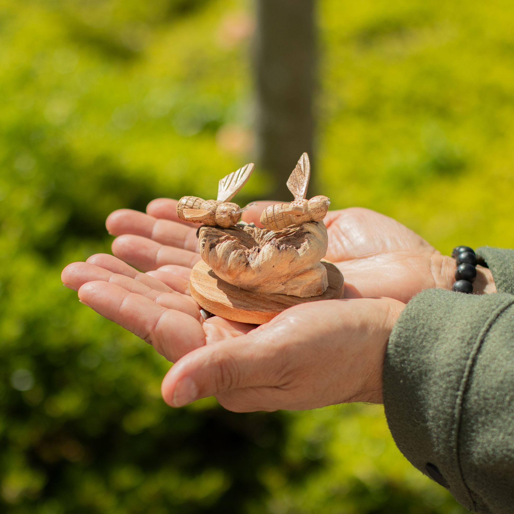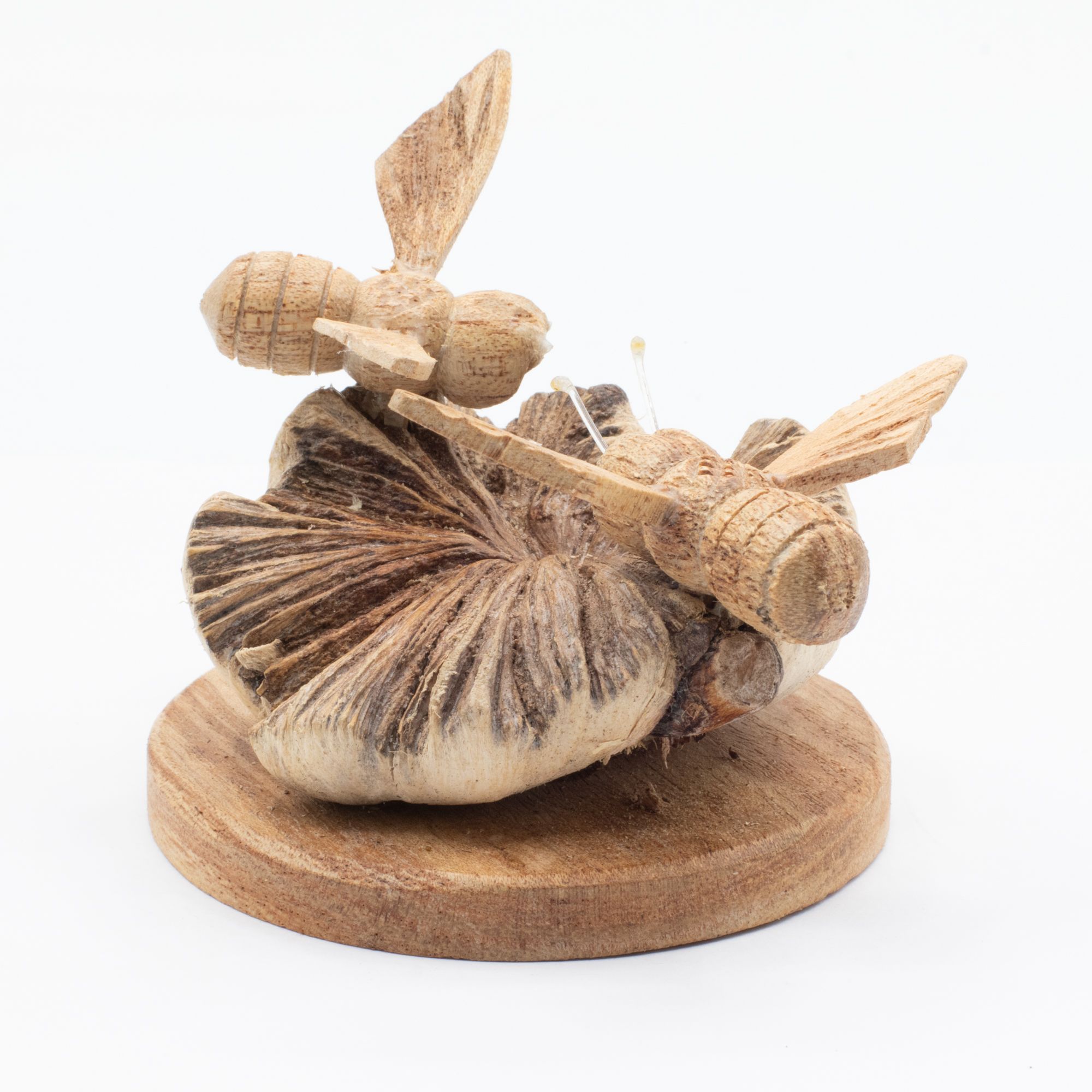 A small piece with real character, this hand-carved design captures two bees resting on a naturally formed wood base. The contrast between the smooth carving and the raw, textured parasite wood creates a look that feels organic and full of detail.