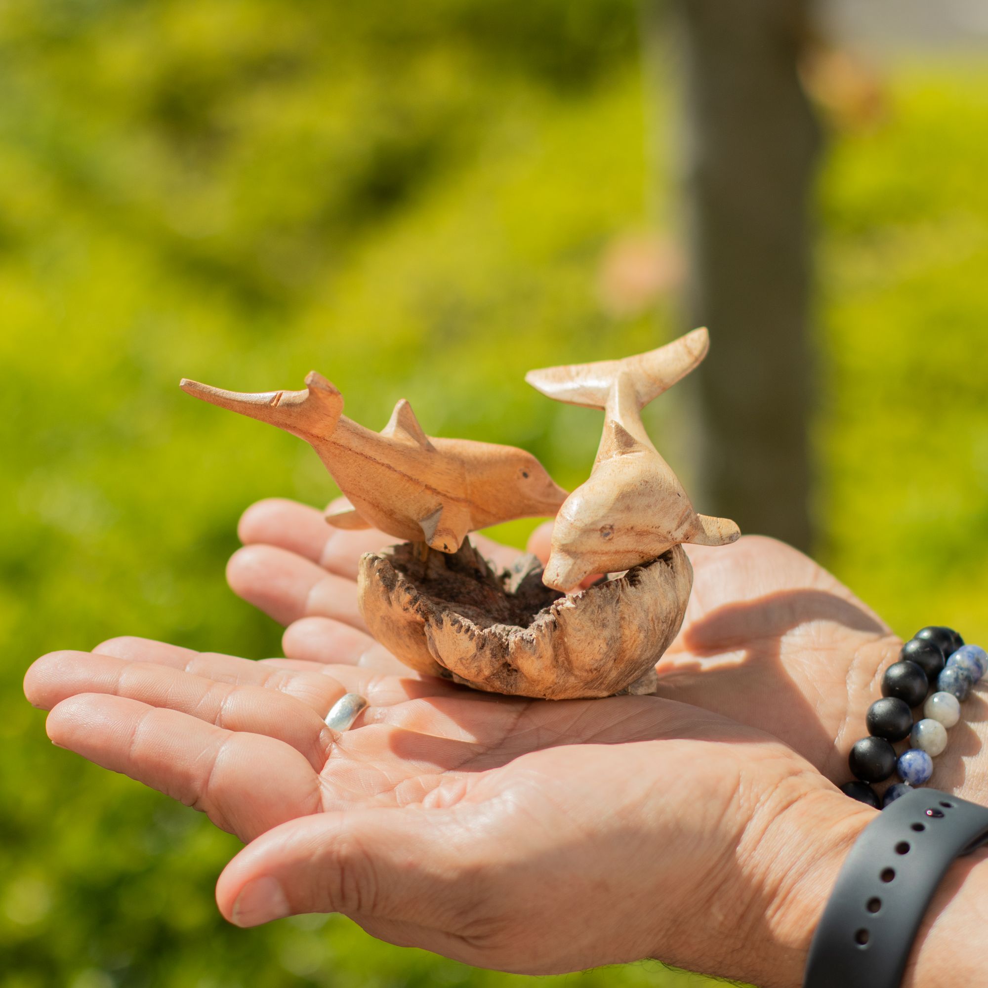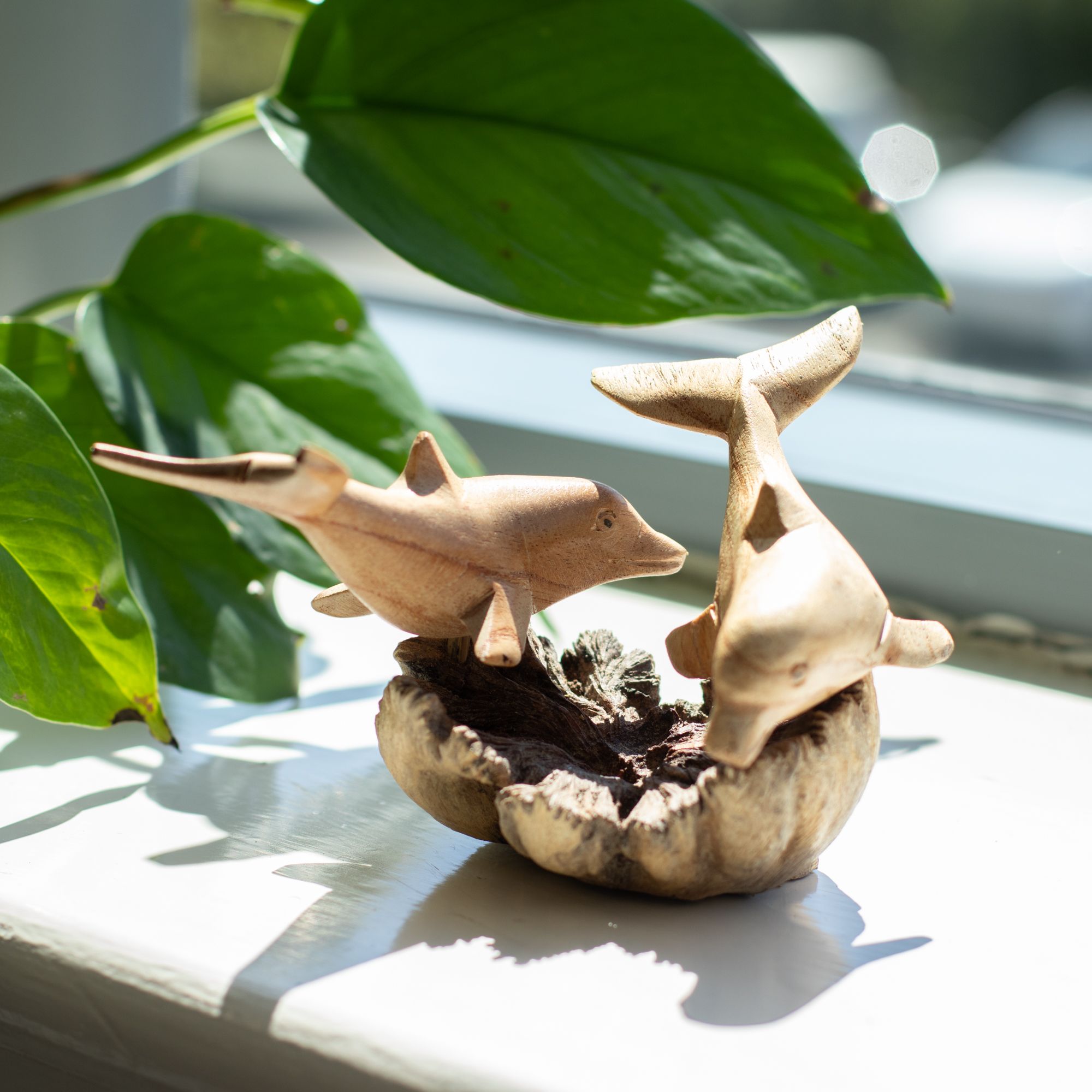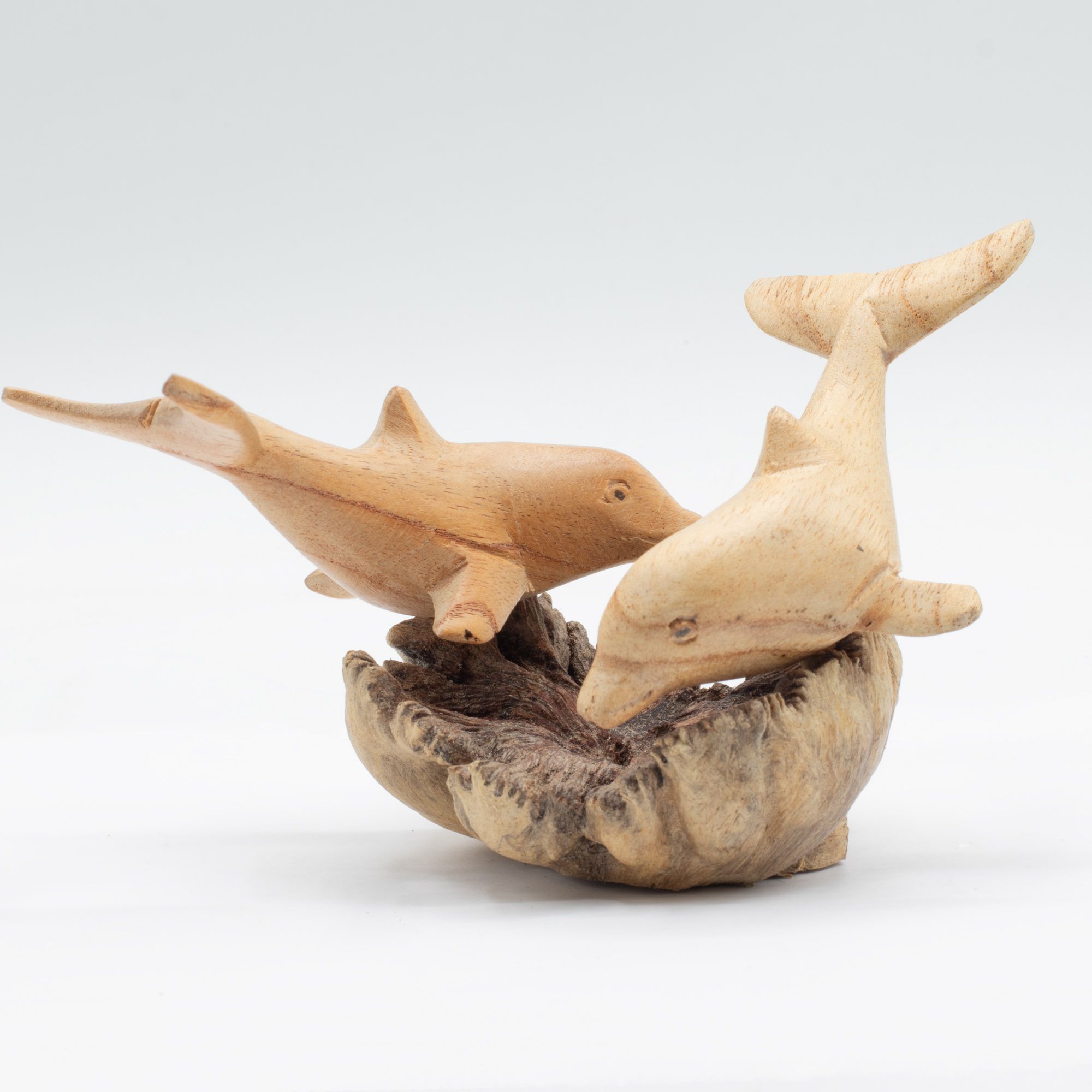 A lively carving featuring two dolphins captured mid-movement, balanced on a naturally formed wood base. The smooth, flowing lines of the dolphins contrast beautifully with the rugged texture of the parasite wood, creating a piece that feels both dynamic and grounded.