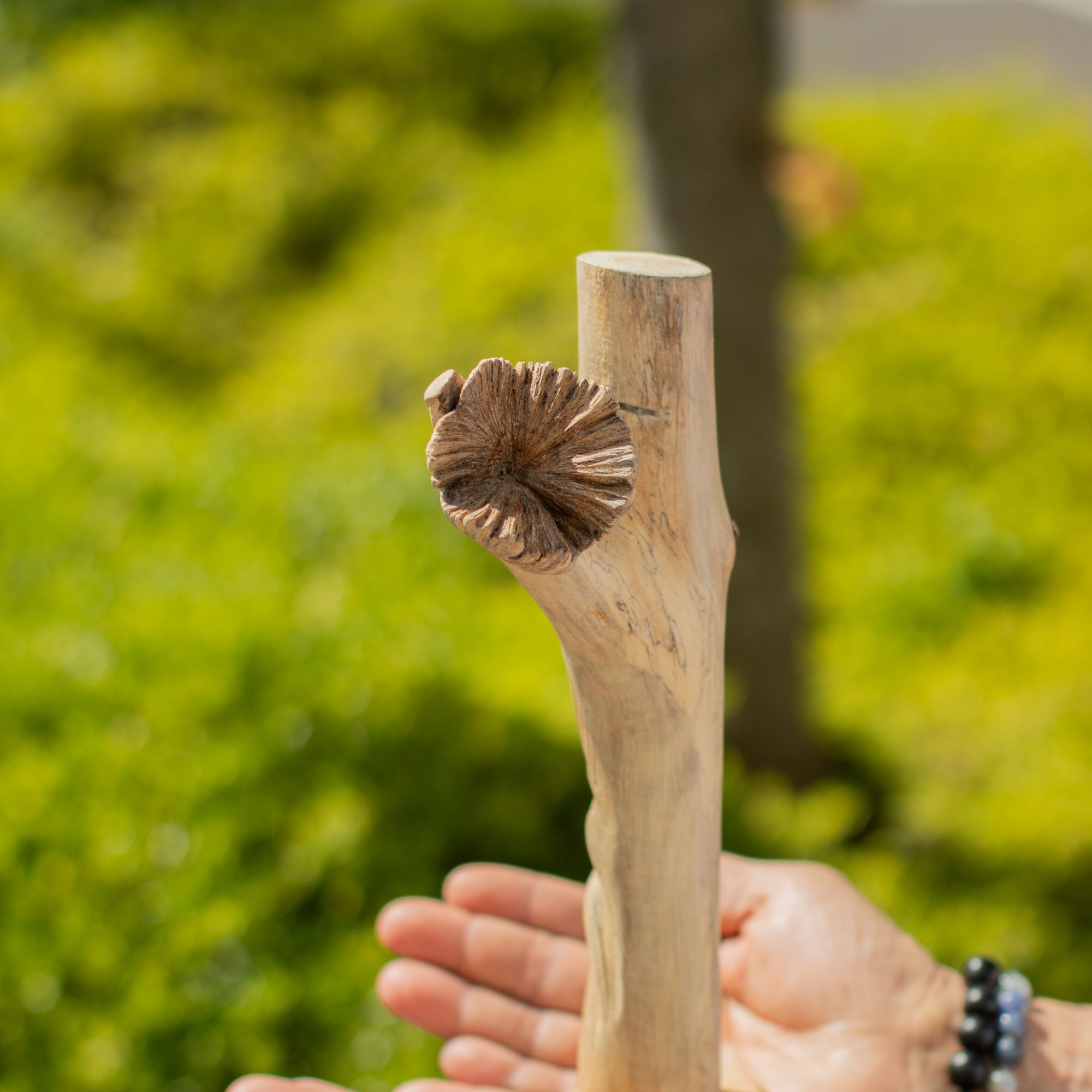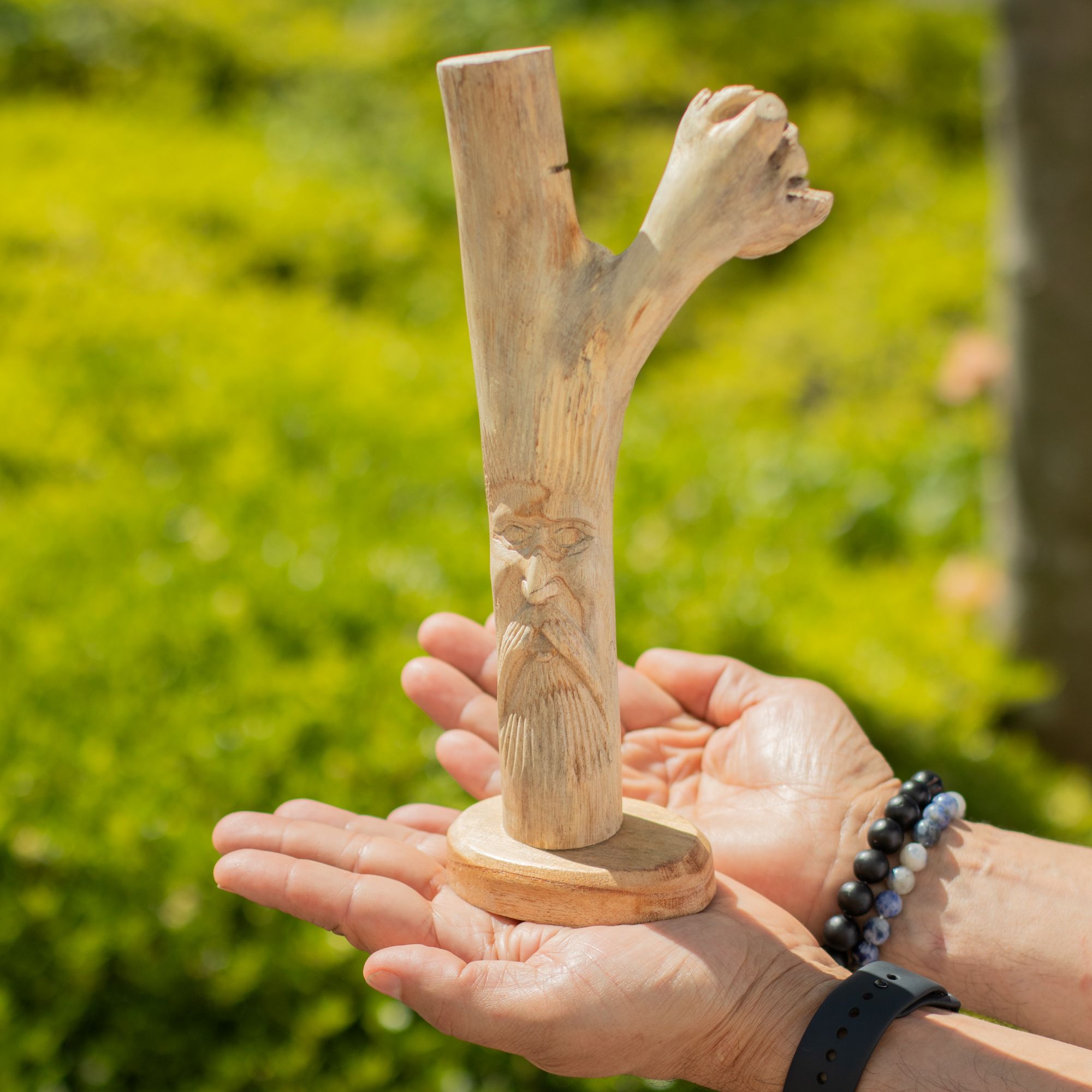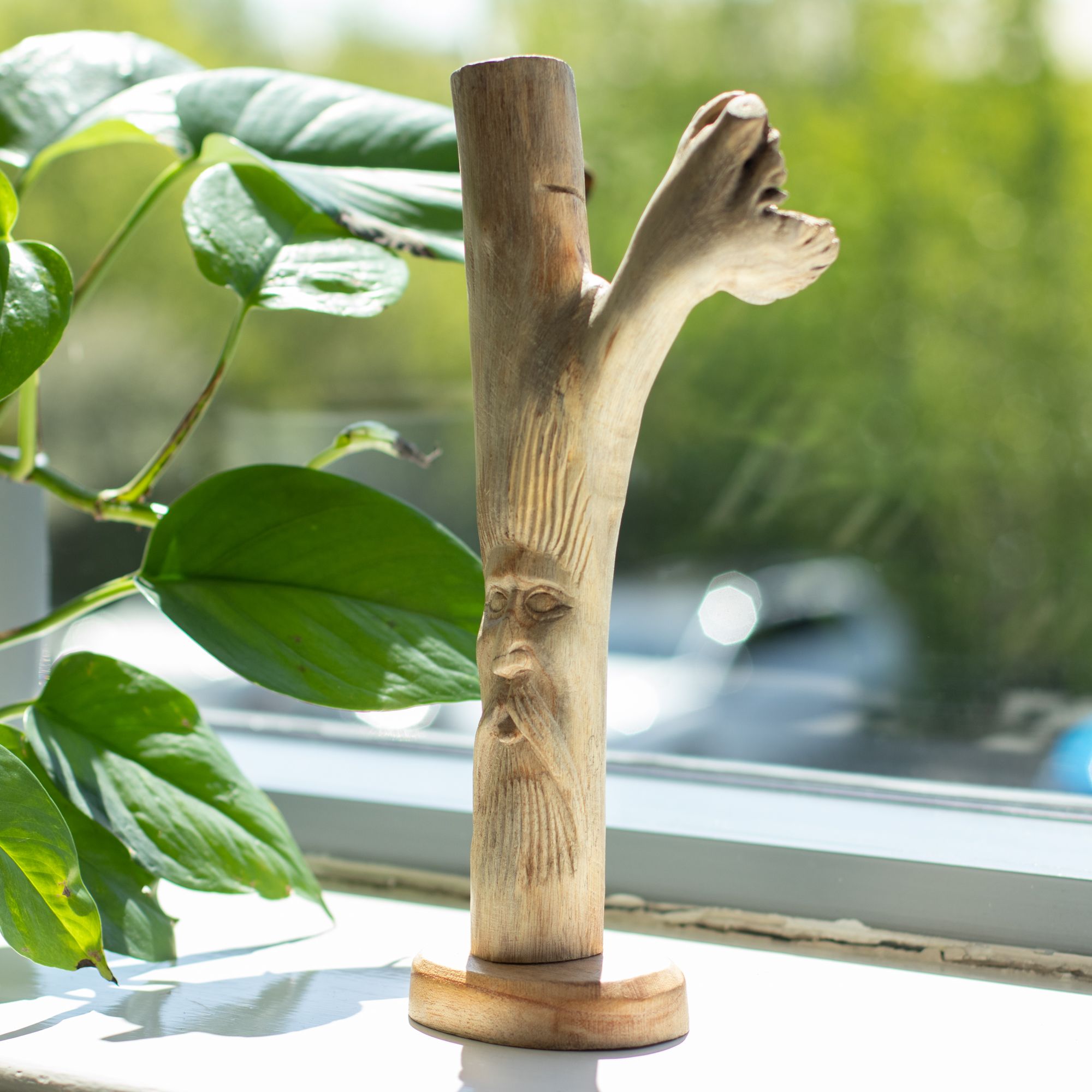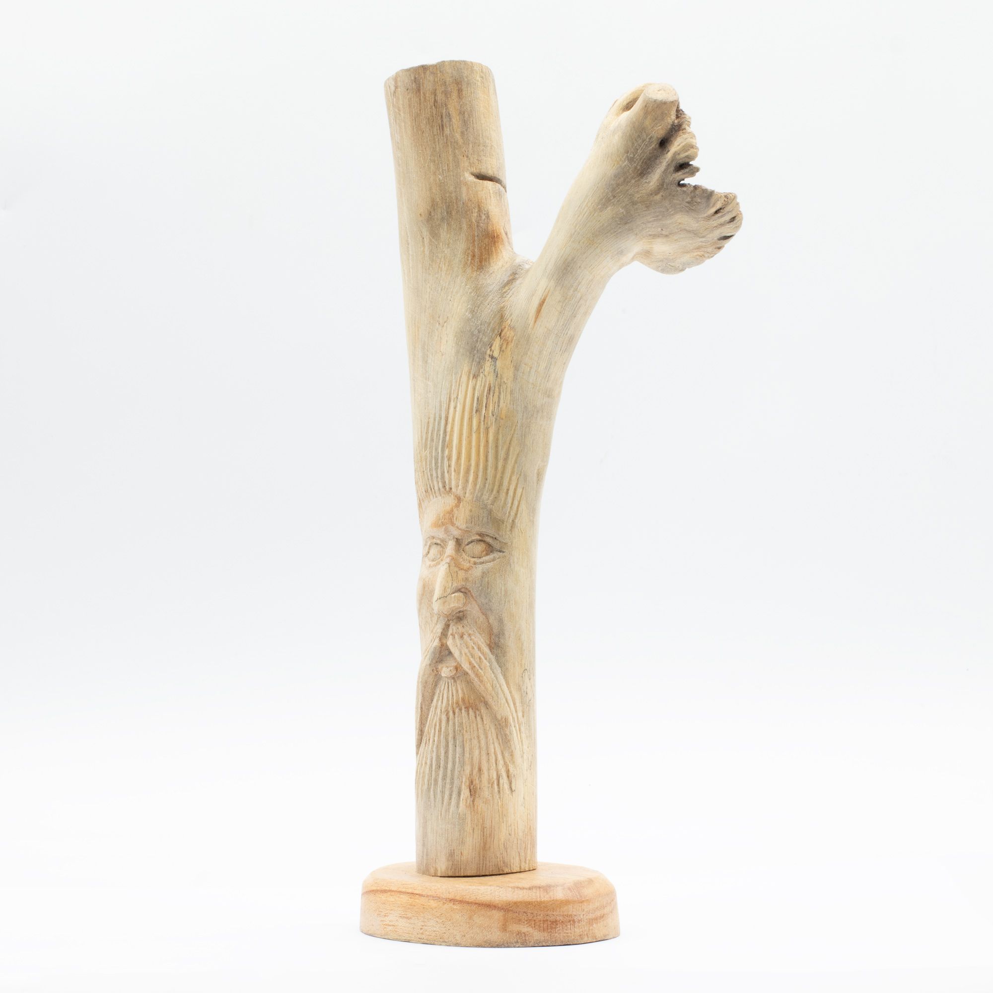 A distinctive woodland piece featuring the classic Greenman face carved directly into natural wood. The upright branch form gives it height and presence, while the detailed facial carving adds character without feeling overworked.