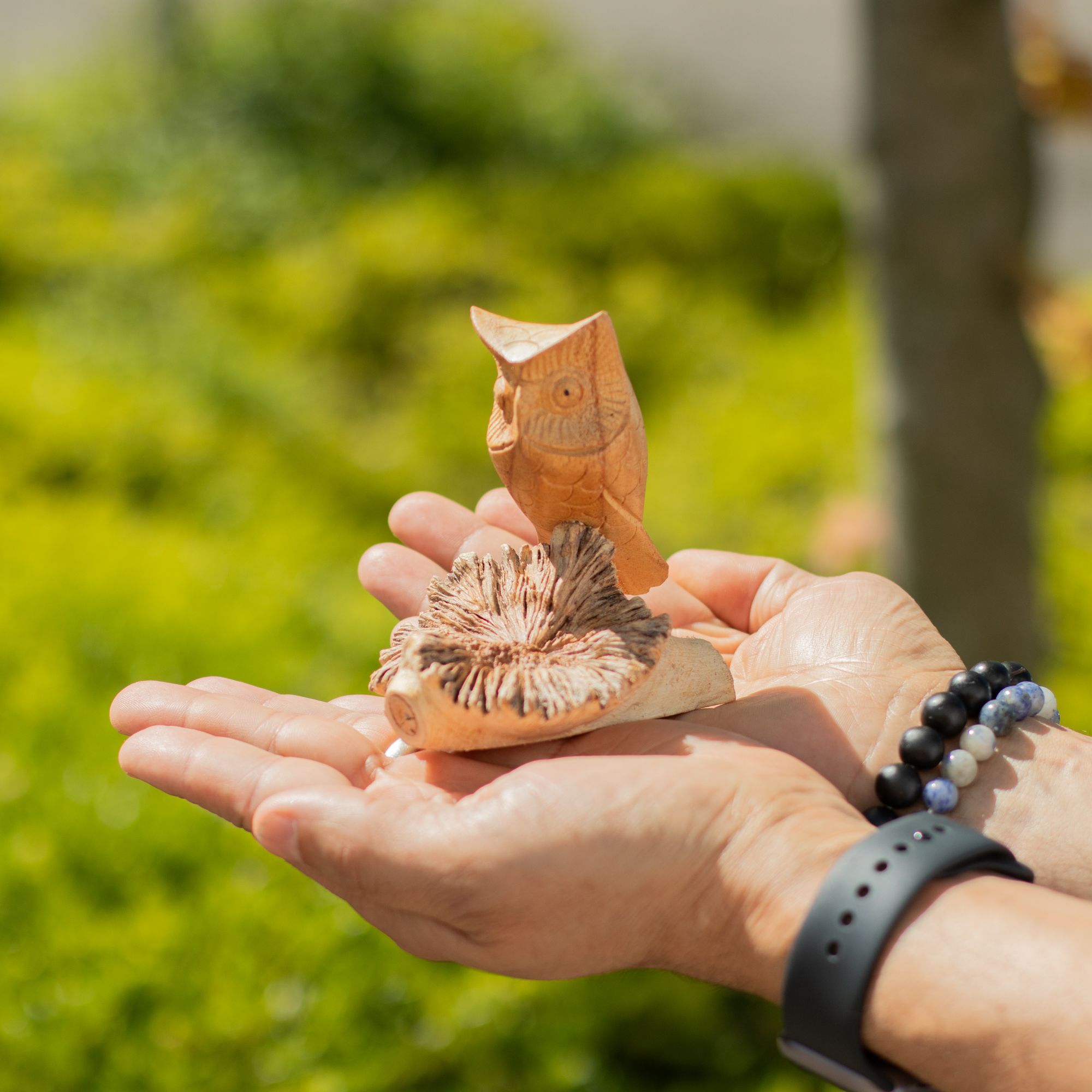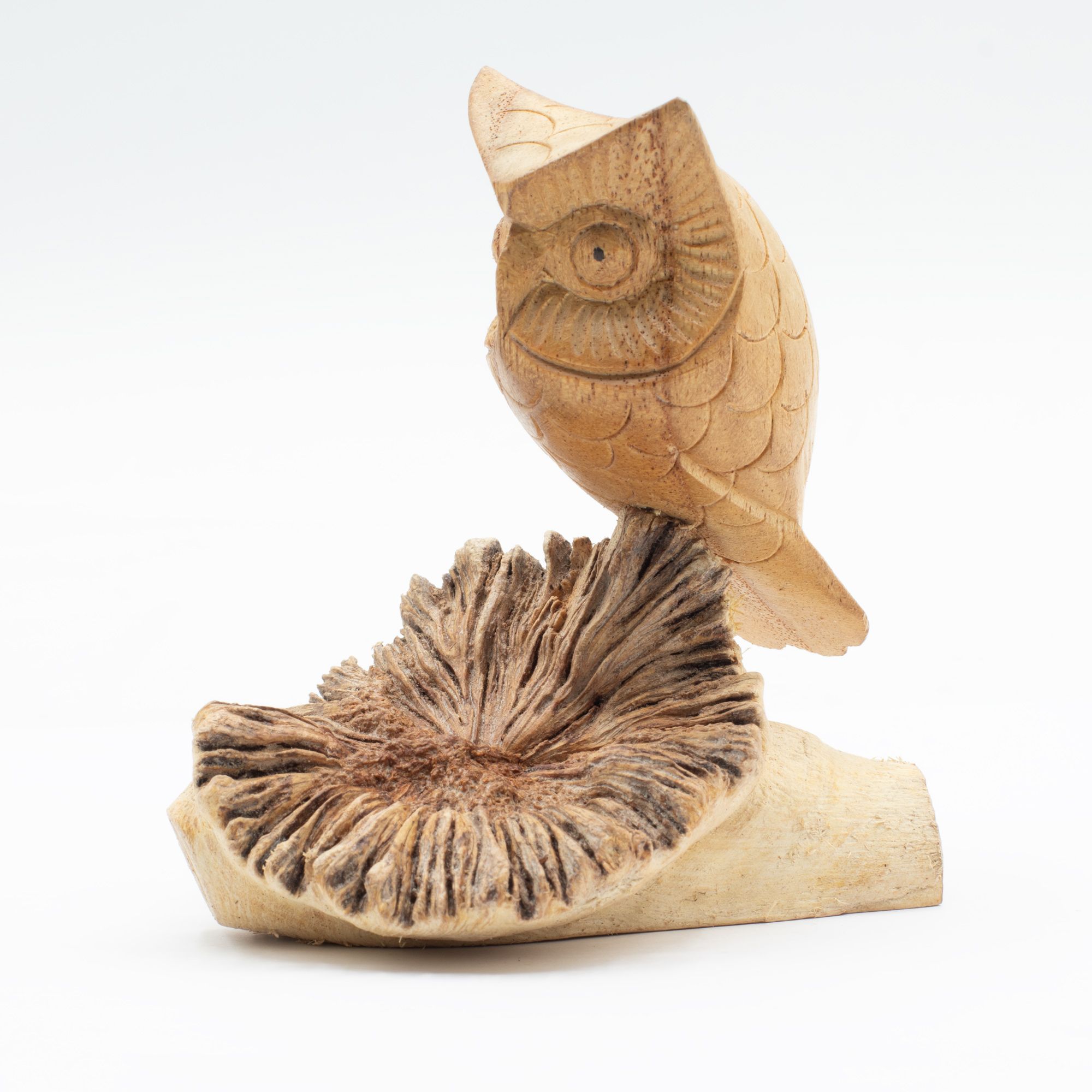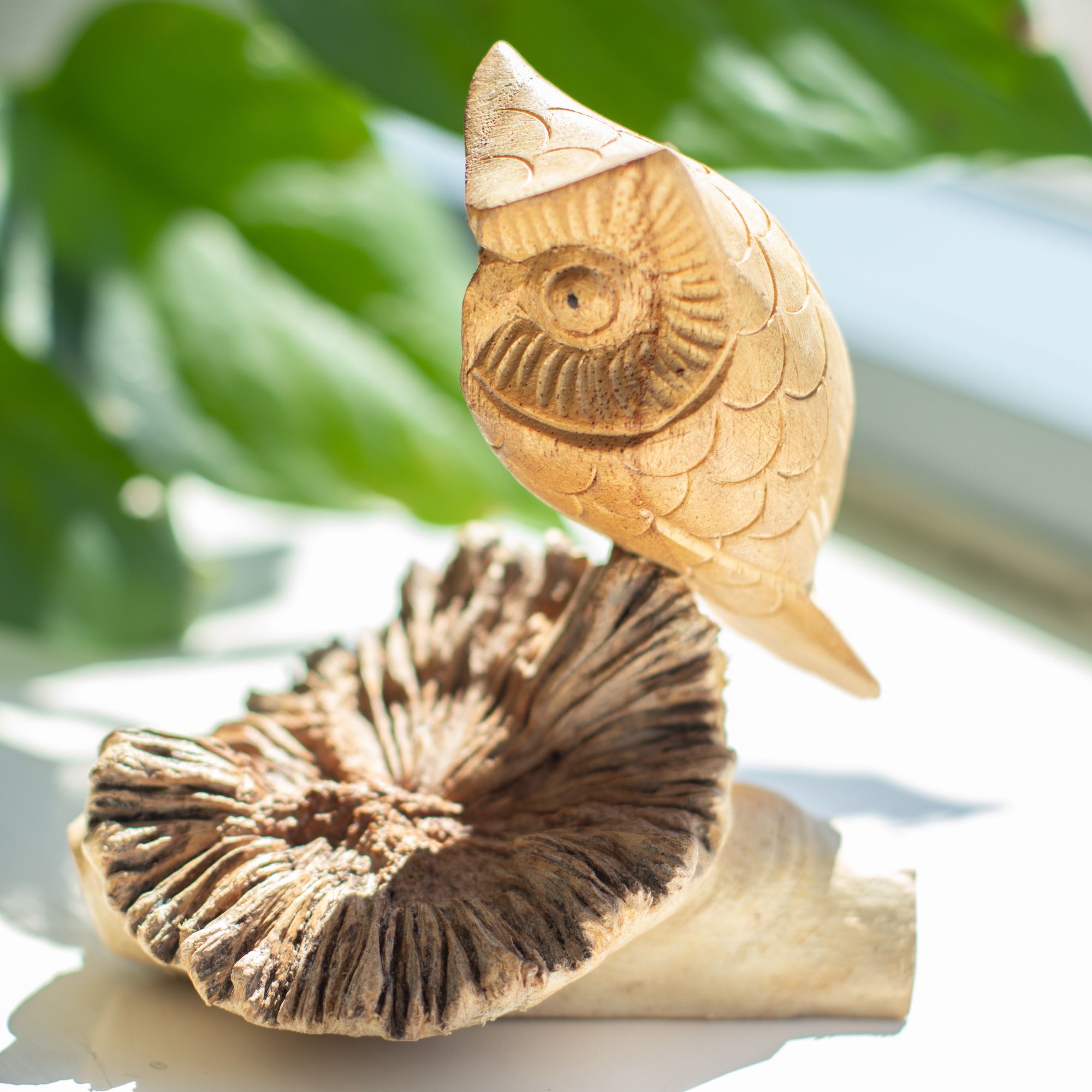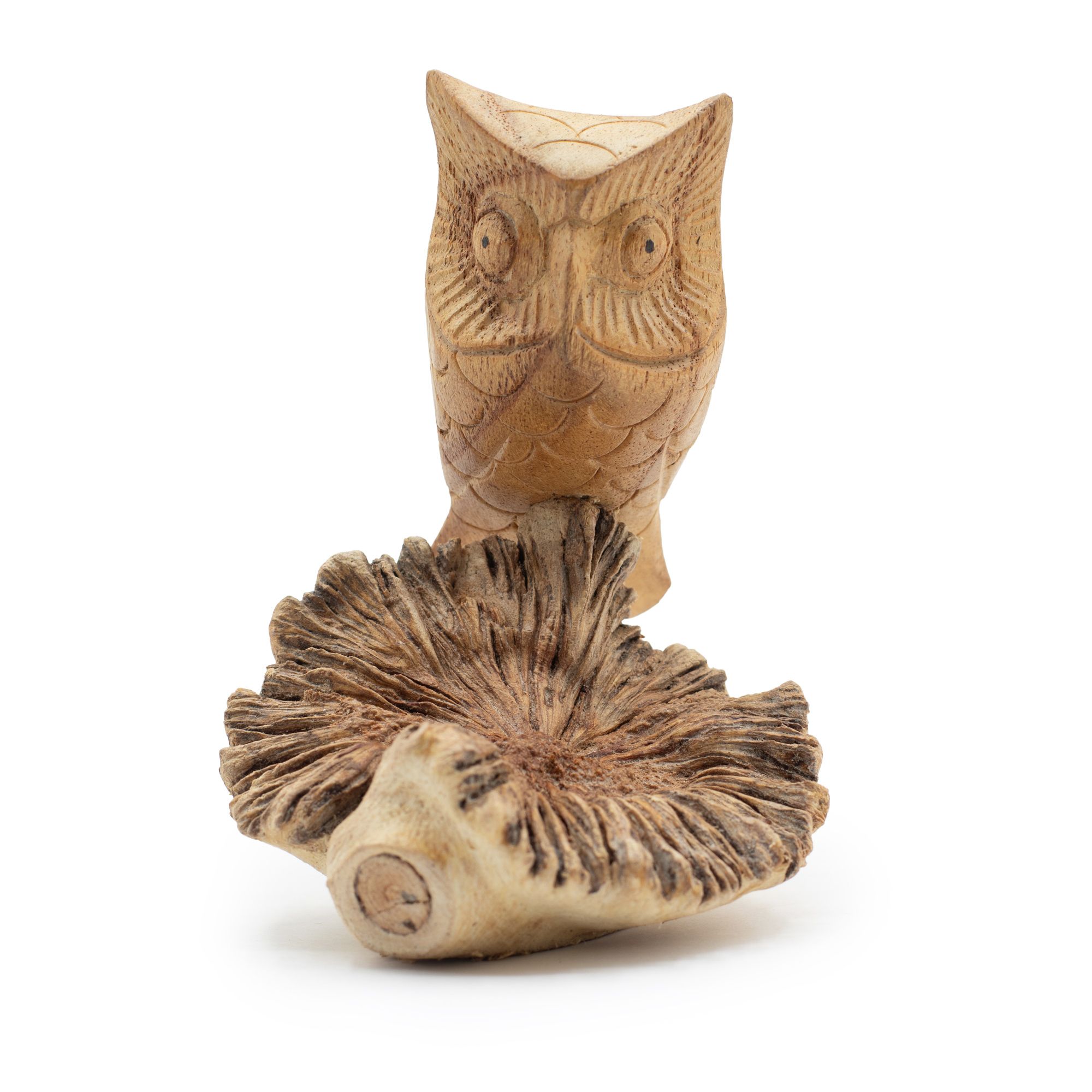 A characterful piece featuring a hand-carved owl perched on a naturally formed wood base. The detailed carving brings out the owl’s expression, while the raw parasite wood adds contrast with its textured, organic shape.