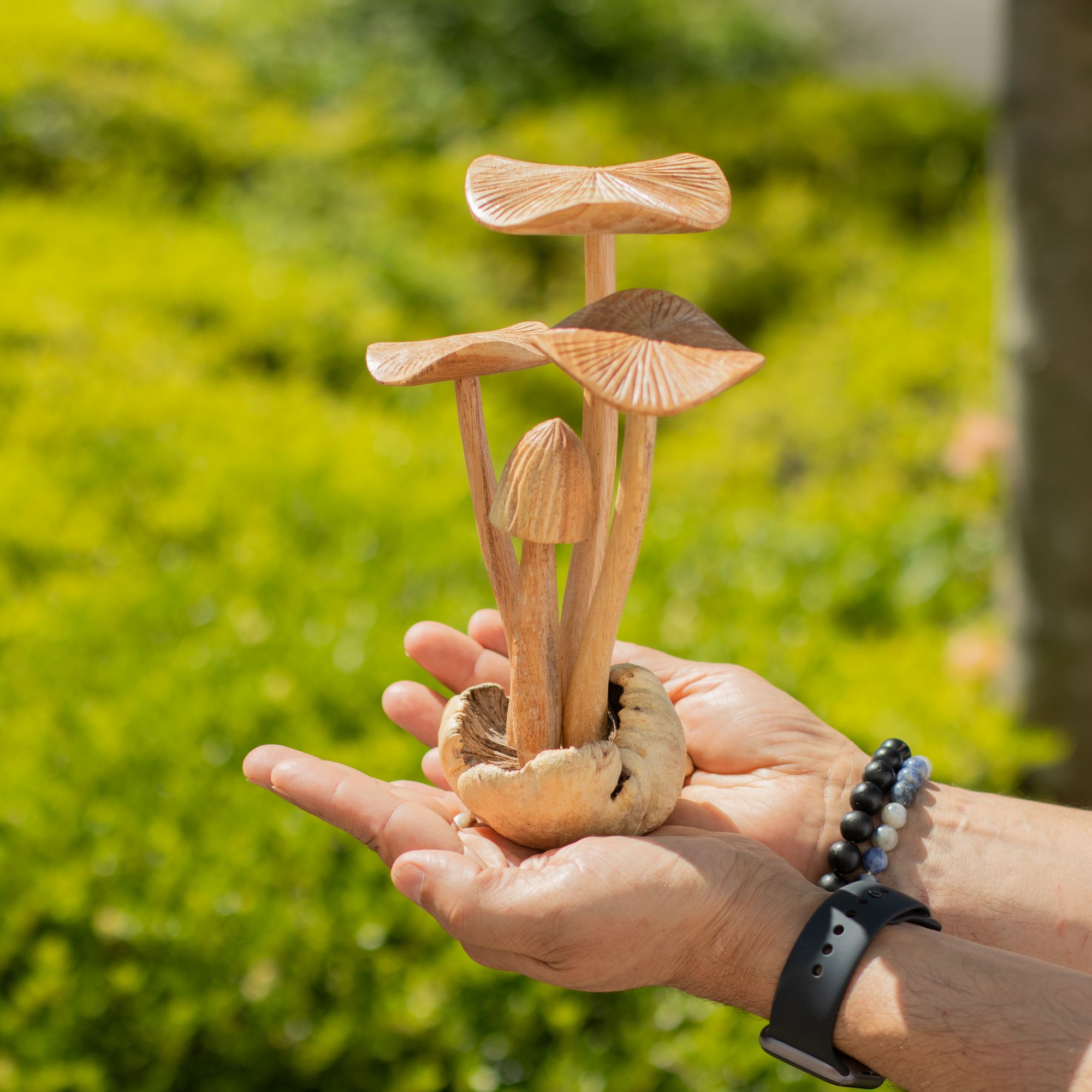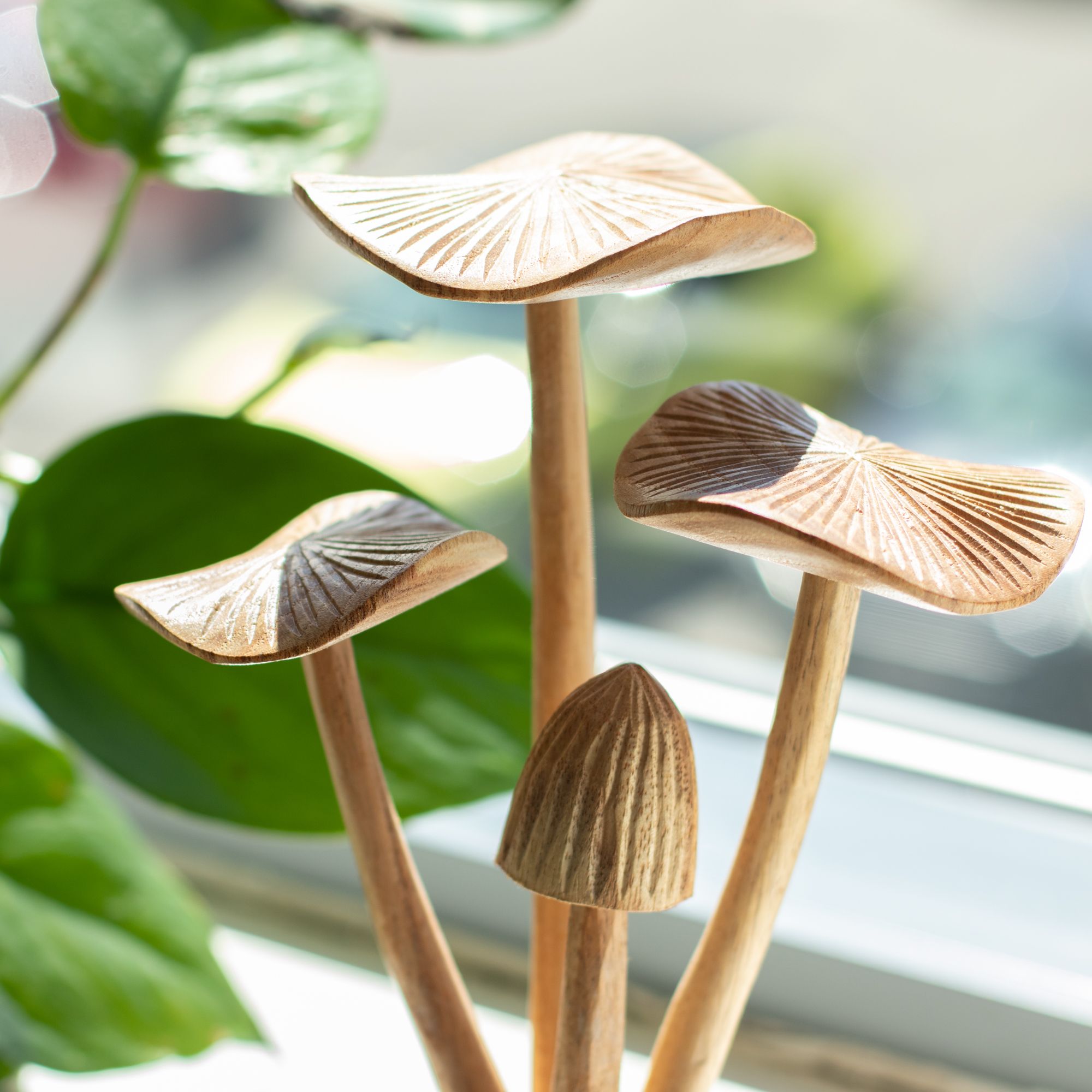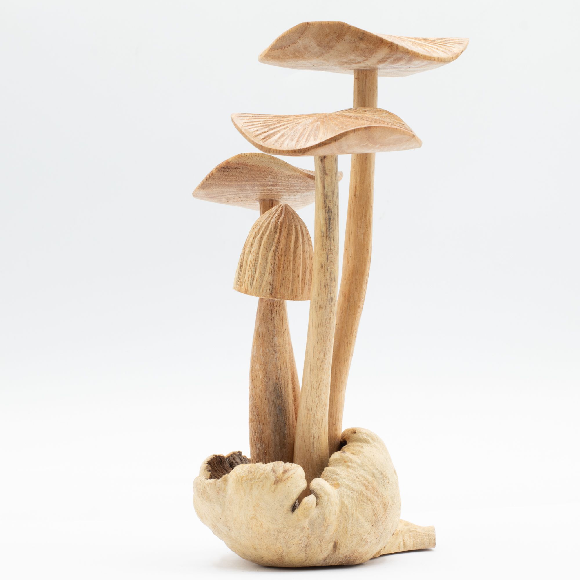 A taller, more eye-catching piece featuring four mushrooms rising at different heights, creating a natural sense of movement and depth. The variation in stem length and cap shape gives it a more sculptural feel, making it a stronger focal point compared to smaller pieces.