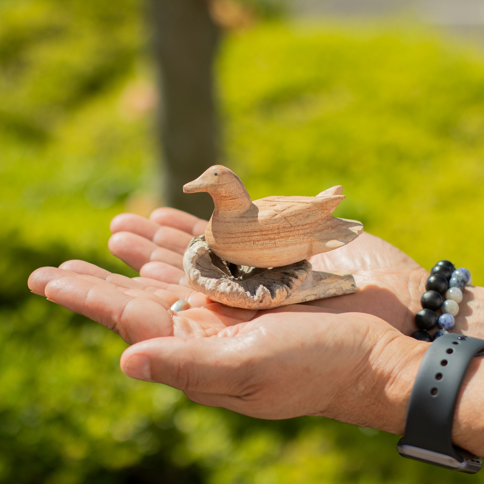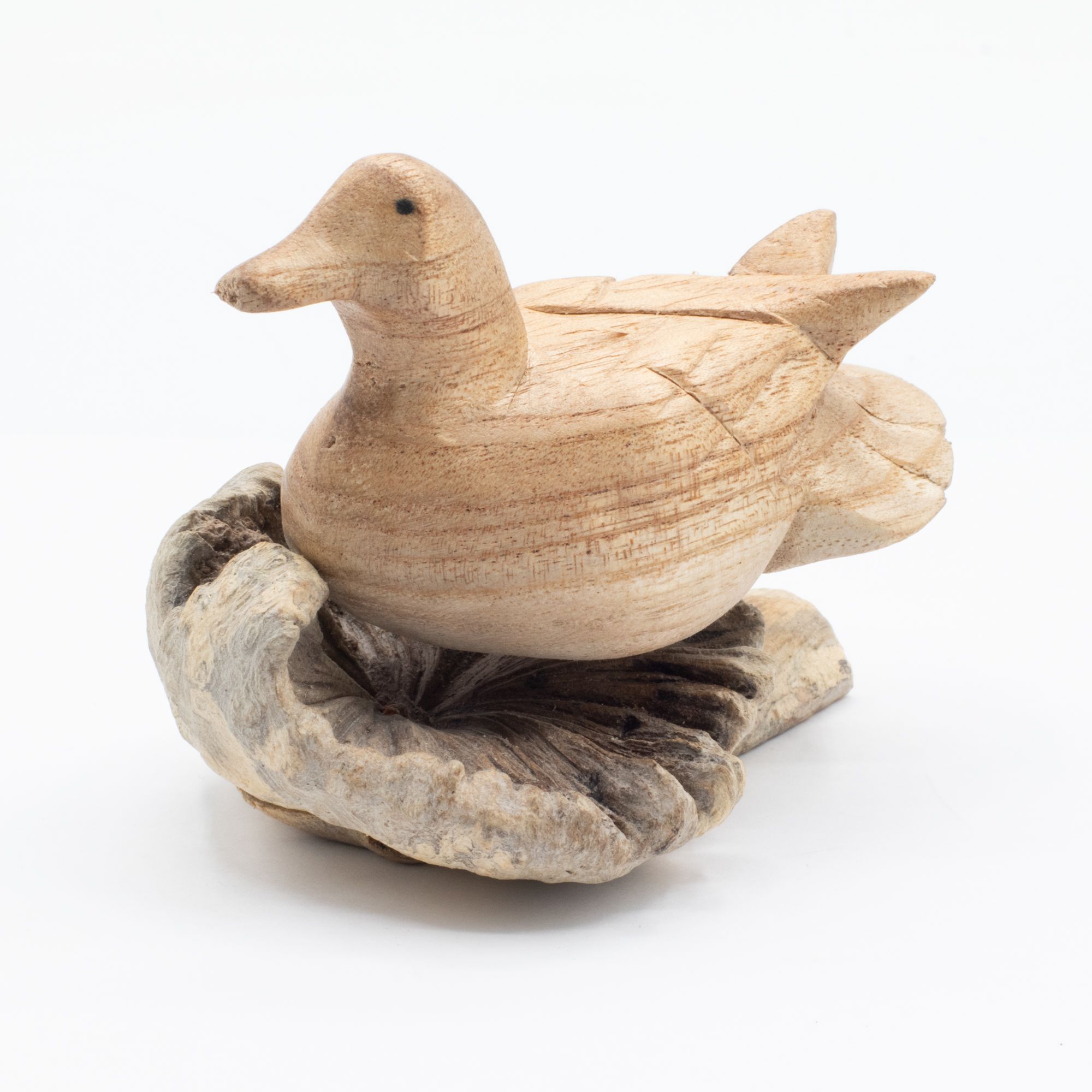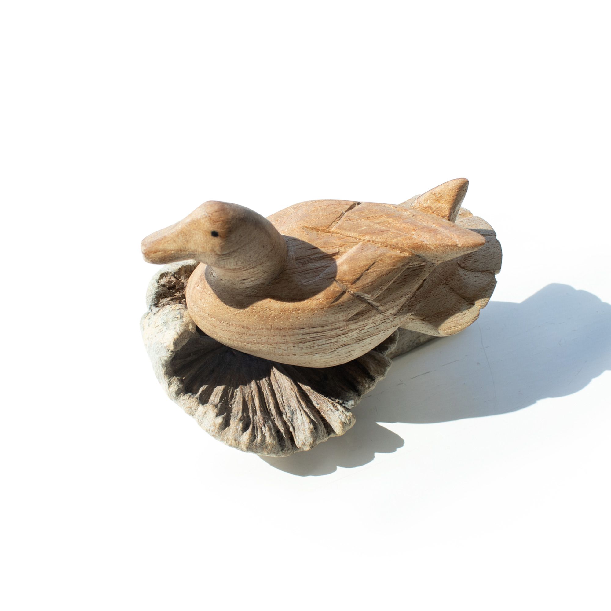 A calm, nature-inspired piece featuring a hand-carved duck resting on a naturally shaped wood base. The smooth detailing of the duck contrasts with the raw, textured parasite wood, creating a balanced and organic look.