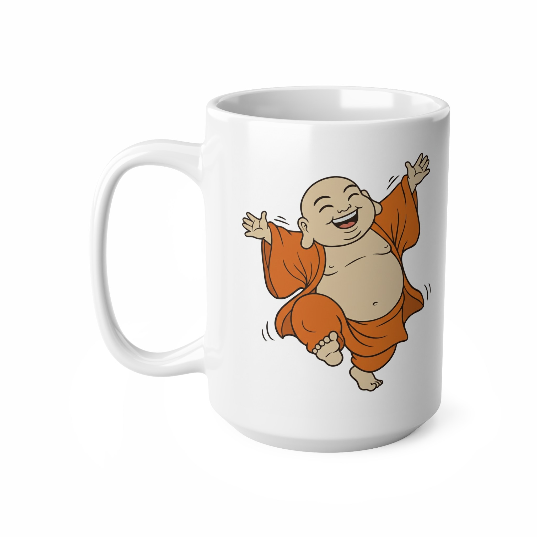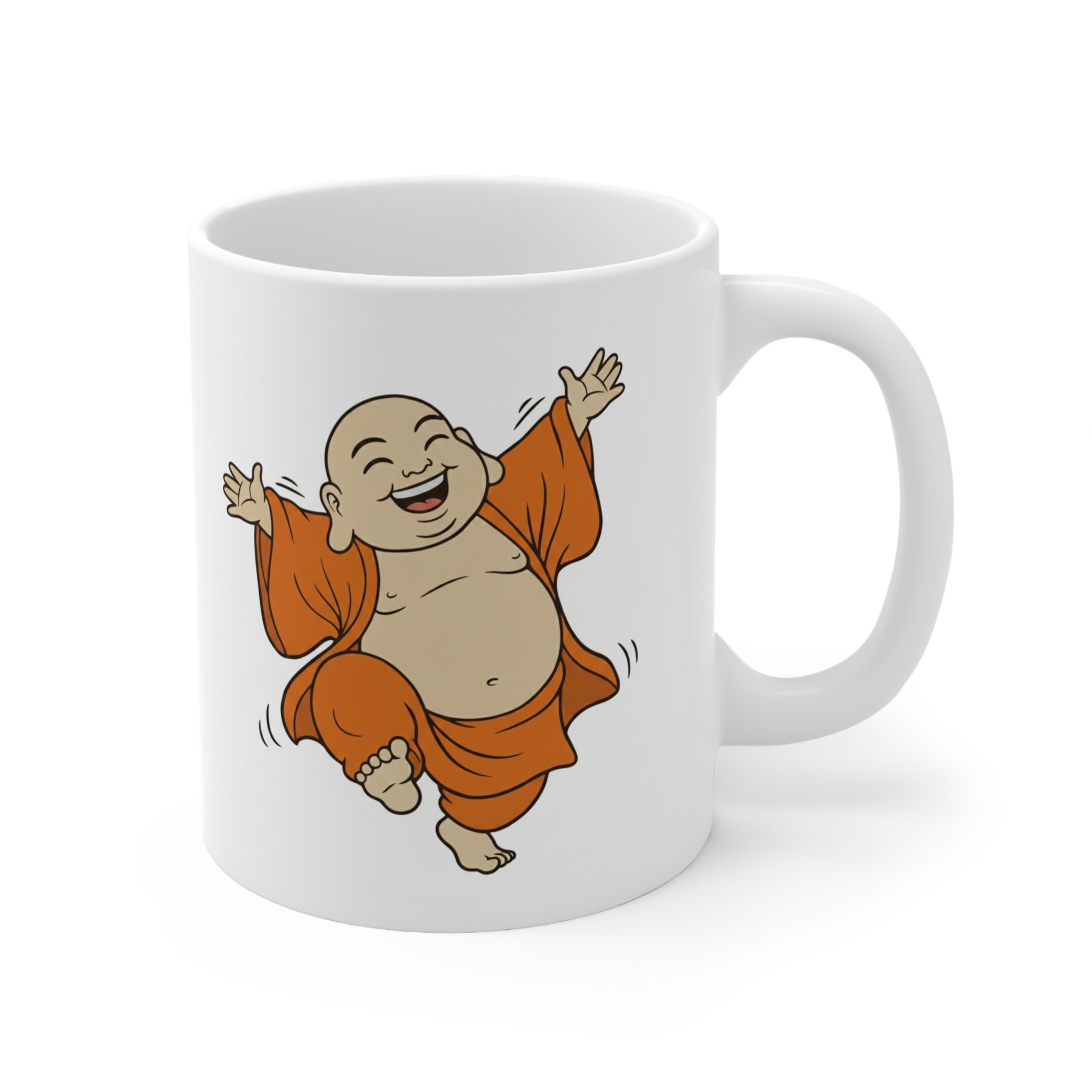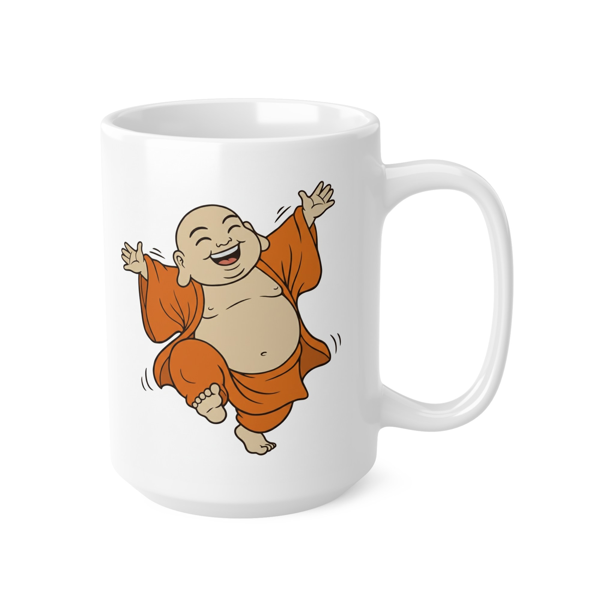 Bright white ceramic mug featuring a joyful, dancing Buddha illustration that brings warmth and light to everyday sips. The glossy finish and high-quality ORCA coating make the colors pop—especially the rich orange robes—so the playful character reads clearly from across the room. With a comfy C-shaped handle and two size options (11 oz and 15 oz), this mug slides easily into morning routines, mindful breaks, or desk altars. Durable, microwave- and dishwasher-safe construction means the image stays vivid through regular use, while lead- and BPA-free ceramic keeps your drink safe. Give someone (or yourself) a small, uplifting moment with every cup.