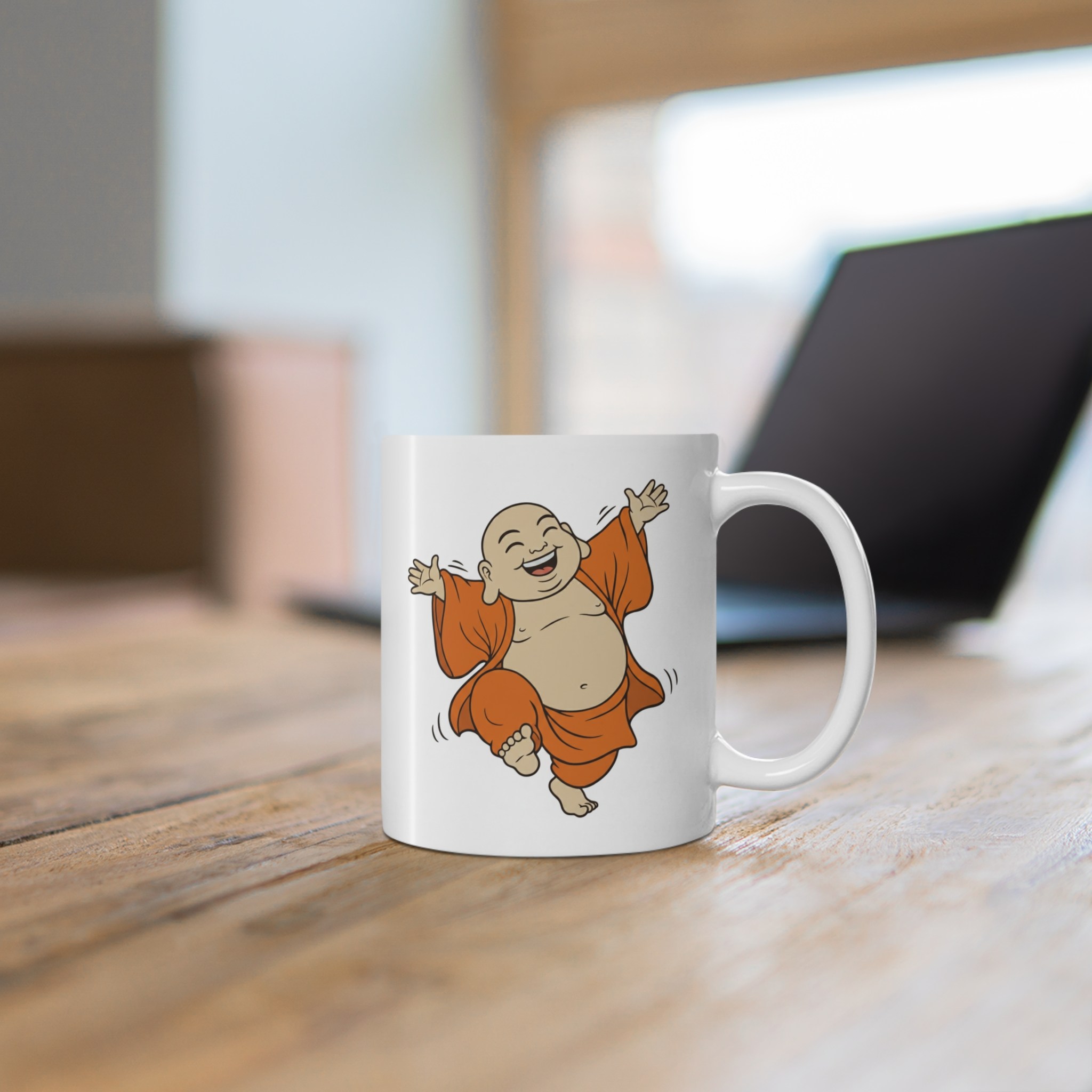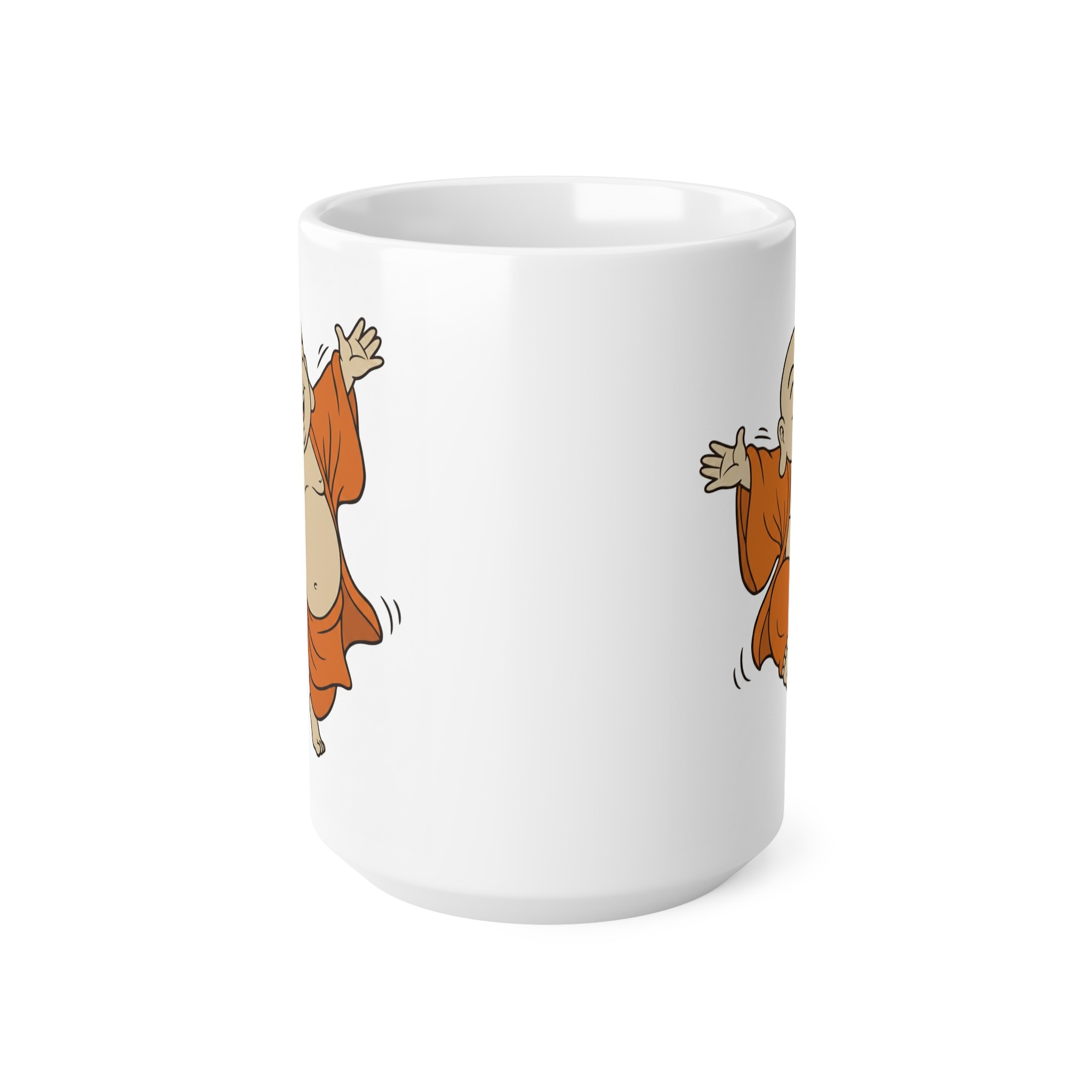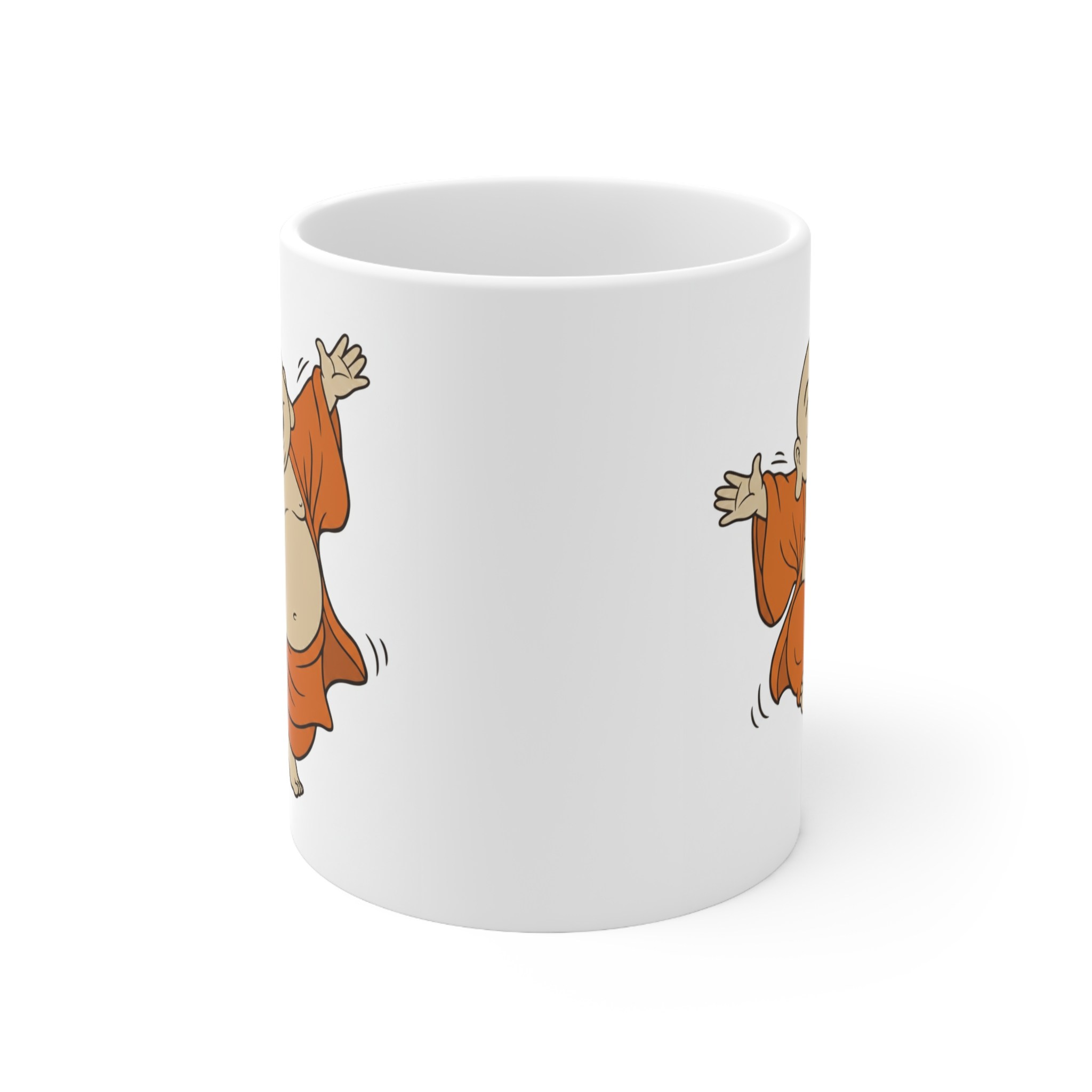 Bright white ceramic mug featuring a joyful, dancing Buddha illustration that brings warmth and light to everyday sips. The glossy finish and high-quality ORCA coating make the colors pop—especially the rich orange robes—so the playful character reads clearly from across the room. With a comfy C-shaped handle and two size options (11 oz and 15 oz), this mug slides easily into morning routines, mindful breaks, or desk altars. Durable, microwave- and dishwasher-safe construction means the image stays vivid through regular use, while lead- and BPA-free ceramic keeps your drink safe. Give someone (or yourself) a small, uplifting moment with every cup.