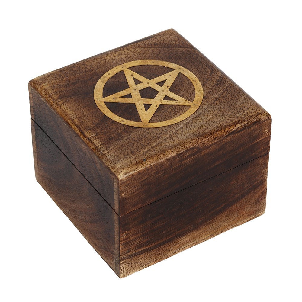 This wooden box has a Pentagram brass inlay and is a great size for storing small trinkets.